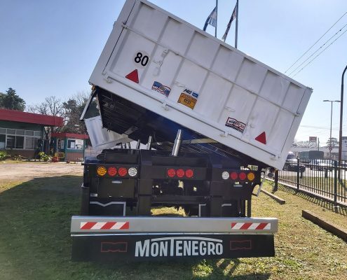 SEMIRREMOLQUE VUELCO BILATERAL (CAJA DOBLE) 1+2 EJES EN TANDEM. NUEVO (0km). MARCA MONTENEGRO INDUSTRIA ARGENTINA DIMENSIONES LARGO TOTAL: 13.500 mm. (Cada caja 6.720 mm). ANCHO: 2.600 mm. ALTURA PLATAFORMA DE CARGA: 1.560 mm. (Con Neumáticos 295/80 R 22.5 Diámetro 1.050 mm.).- ALTURA DE ENGANCHE: 1.350 mm CAPACIDAD: 45.000 Kg. (PBTC, con camión 4x2, según D. N. V.).